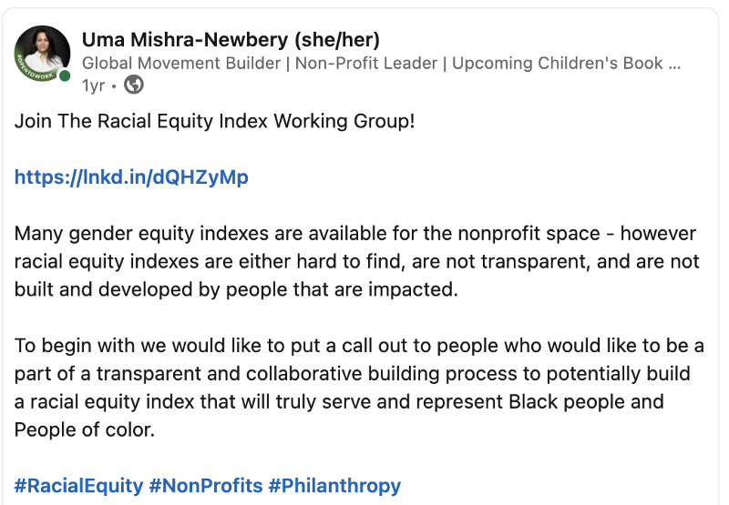 The Racial Equity Index started as an idea that was born out of frustration, trauma, anger, and disbelief that a women’s rights sector working to promote and uphold women’s human rights was with the very same breath, gaslighting and causing so much trauma to BIPOC people in the sector. I had witnessed for too long in the women’s rights space, the championing of gender equality with zero acknowledgment of racial equity. There are a good number of gender equality indexes (note not equity) in the global development space. Some of these indices work to promote the idea that if the sector moves forward using feminist leadership principles then we can one day, hopefully, achieve gender equality in the sector. This narrative is problematic and shortsighted because it fails to acknowledge the immense harm that white feminist leadership and white feminism, in general, have caused in the global development sector. This narrative has continued to been amplified — most recently by WILD, who were held accountable by the Racial Equity Index for their completely white panel on feminist leadership (in 2021), and who only added people of color to the panel after this Twitter post by the Racial Equity Index.