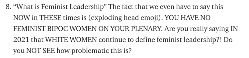 If the gaze of feminist leadership continues to be publicised and promoted as white, without talking about the real harm that white women and white feminism have caused to BIPOC folks in this sector*, how then do any of the gender equality indices that are based on this gaze and narrative, promote justice and equity for BIPOC folks in the sector?